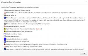 - The levels descriptions (detailed above) are also available in the Race Hub in the Waymarker panel by clicking the Question Mark (?) icon alongside the filter. Details of all Waymarker types is available on the Help button.