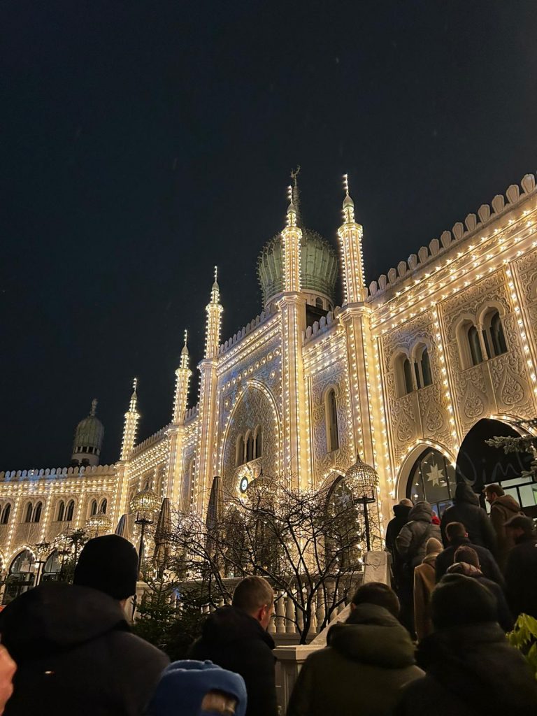 As we headed to dinner, we walked through Tivoli Gardens, which was particularly memorable as the park looked incredibly festive, with Christmas lights twinkling everywhere, and the snow only added to the magical atmosphere. We enjoyed a sumptuous three-course dinner at Nimb, a beautiful restaurant right within Tivoli, making for an unforgettable evening.