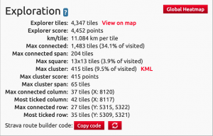 The VeloViewer Explorer Global Heatmap provides a view of all the world’s tiles coloured to show how many people have visited each one. These visitor counts for each tile are then used to calculate the Explorer Score. More details on Global Heatmap available here.