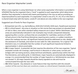 - For climbs, teams have fed back that they would like the climb name entered into the description field on the KOM waymarker. Also, if you have pavé/gravel sectors which are named/numbered then please add that information to the description to the pavé/gravel start waymarker.