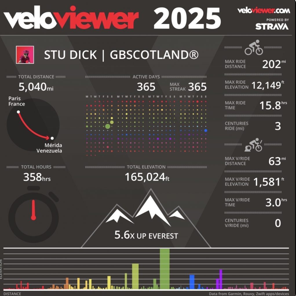 Scottish rider Stuart Dick is a keen VeloViewer user and has kept us regularly updated with his infographic progress throughout the year as he chased his target of 365 active days.